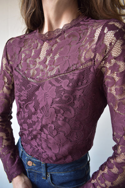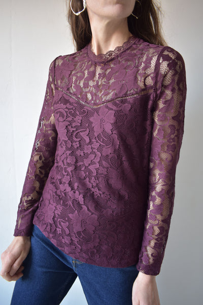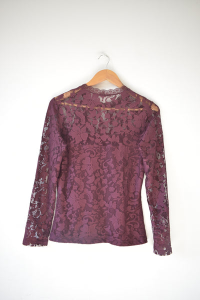 Pansy est un top fin manches longues dentelle bordeaux en T38.