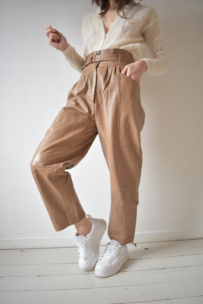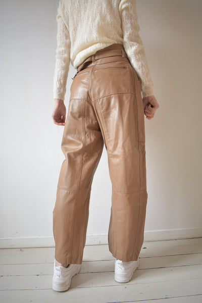 Assez rare à trouver, un beau pantalon 100% cuir vintage beige foncé, taille haute, coupe proche du cargo.