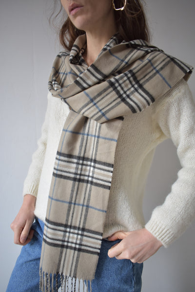 Jolie écharpe qui ne gratte pas, dont on aime la teinte gris crème et les jolis carreaux.