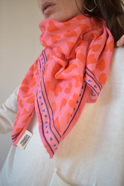 Le foulard grand format rose vivifiant recouvert de coeur et de Family Fever par Frangin Frangine.