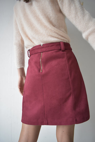 Hopa est une jupe en suédine bordeaux Cache Cache dotée d'une jolie ceinture.