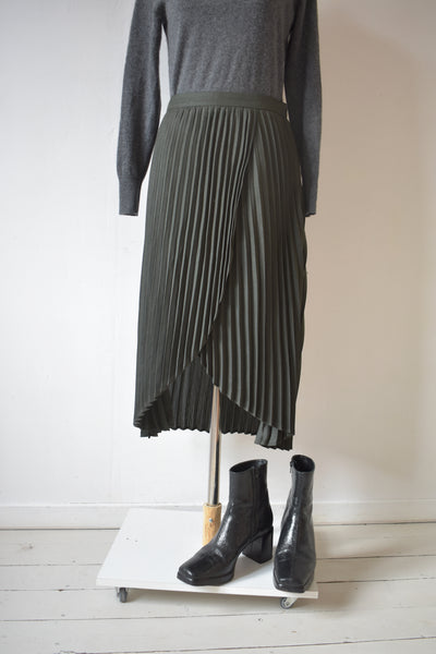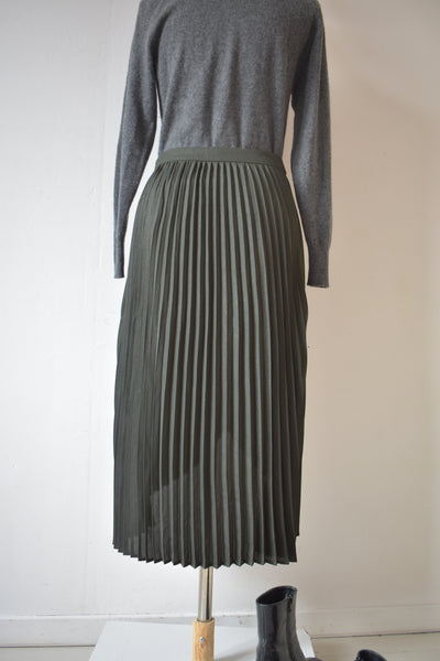 Plissée est une jupe midi kaki pailleté Camaïeu en T38.
