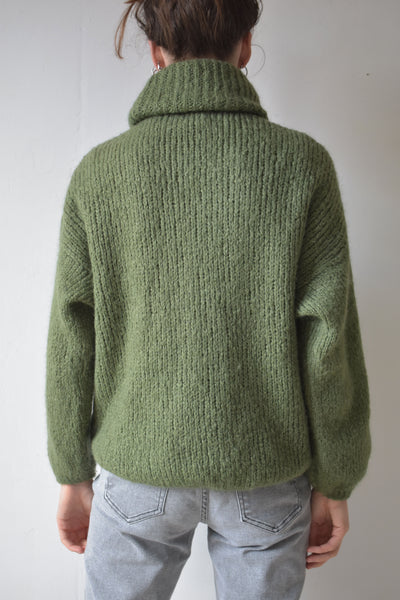 Matcha est un pull kaki clair col roulé X en TU. Idéal, T42 à T44.