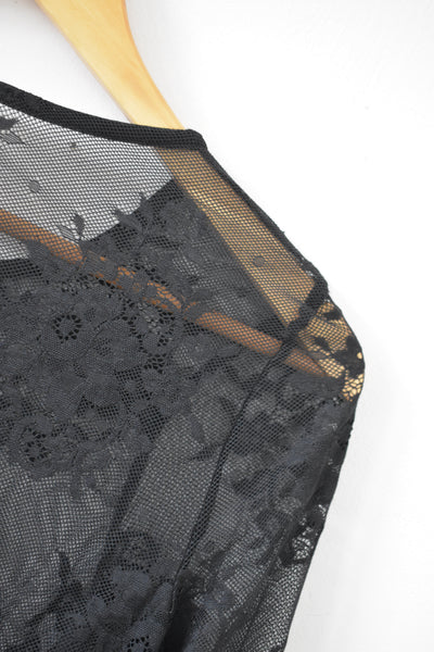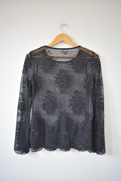 Top dentelle noire transparente, manches évasées.