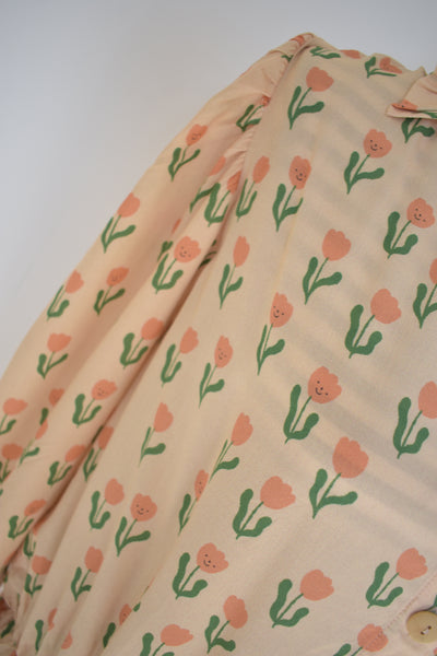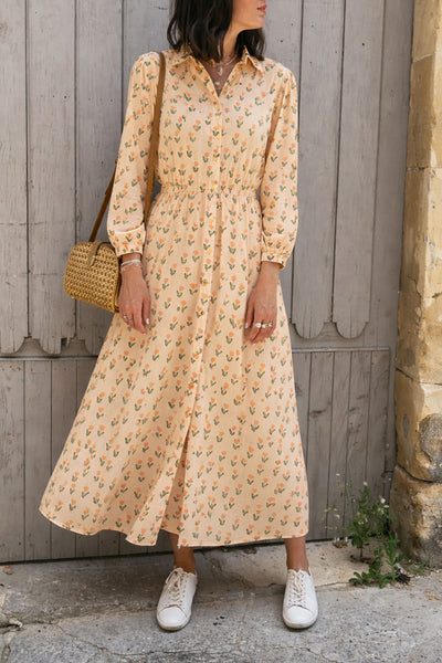 Robe chemise fleurs smile teinte abricotée.